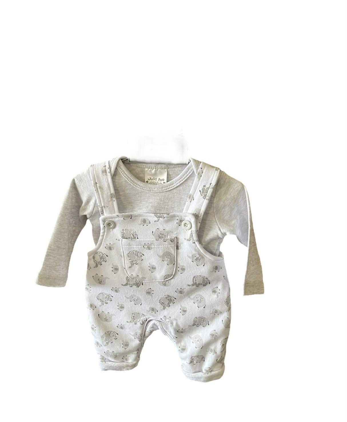 Unisex White and Grey Dungaree Set with long sleeve silver grey jumper and patterned knotted beanie hat.